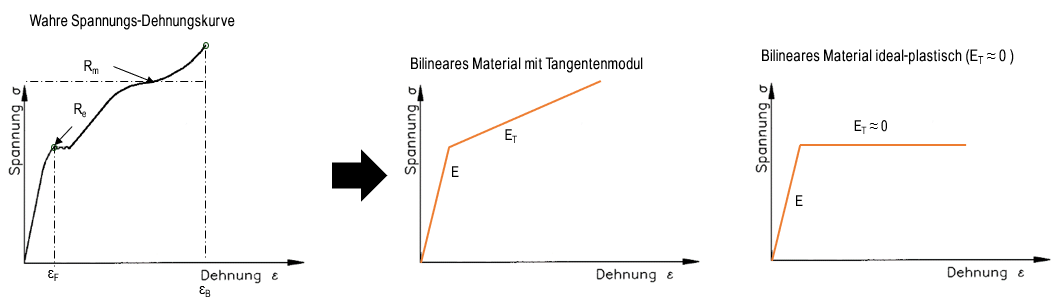 In einer FEM-Berechnung können verschiedene Werkstoffmodelle verwendet werden. Die einfachste Analyse erfolgt mit linear-elastischem Materialverhalten, bei dem die Spannungen immer proportional zu den auftretenden Dehnungen sind. Je nach Anforderungen kann auch ein plastisches Materialmodell implementiert werden, bei wechselnden Lasten auch unter Berücksichtigung des Bauschinger Effekts.
