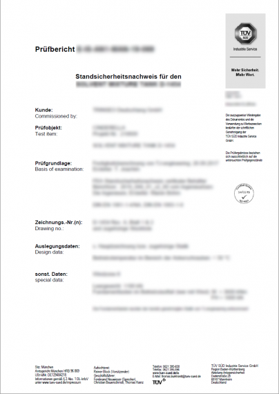In unserem "Rundum-Sorglos-Paket" bieten wir Ihnen die komplette Betreuung der Abnahme des Berechnungsberichtes an, auf Wunsch inklusive den Kosten der Überprüfung durch unseren Ansprechpartner beim TÜV Süd.